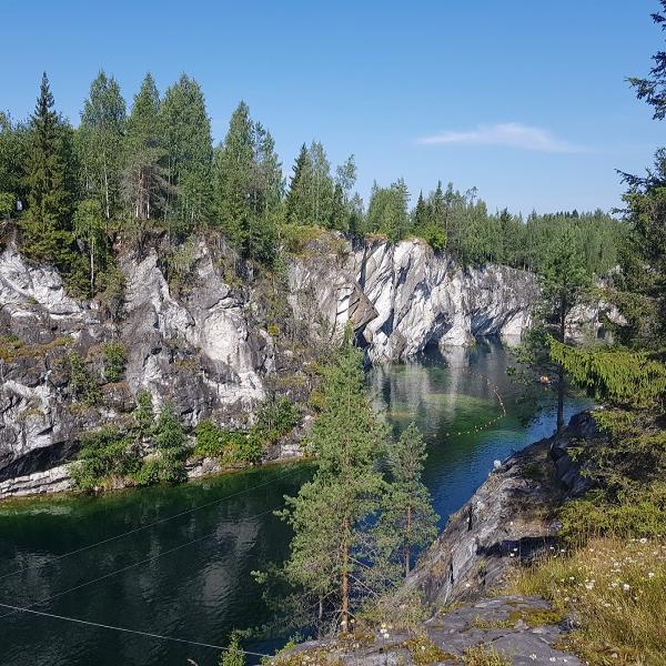 Экскурсия по тропам истории Горного парка Рускеала. Жемчужиной этого парка является знаменитый Мраморный каньон. Огромная чаша, вырубленная руками человека в массиве мраморного пласта, наполовину наполнена чистейшей водой изумрудного оттенка. Она обрамлена пологими и отвесными скалами, возвышающимися высотой до 25 м. над гладью озера. Каньон, окруженный мраморными стенами, привлекает своей красотой в любое время года. Добыча мрамора здесь велась в XVIII и XIX веках, именно отсюда доставляли мрамор для Мраморного и Мариинского дворцов, Исаакиевского собора.