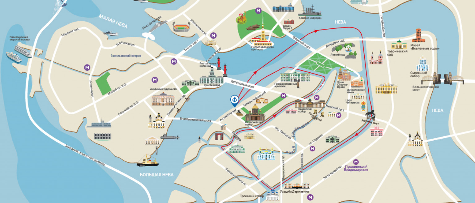 - Причал «Медный всадник», Английская наб. (напротив Александровского сада) (с 11:25 до 19:25)
