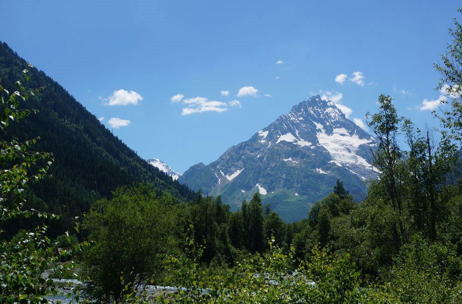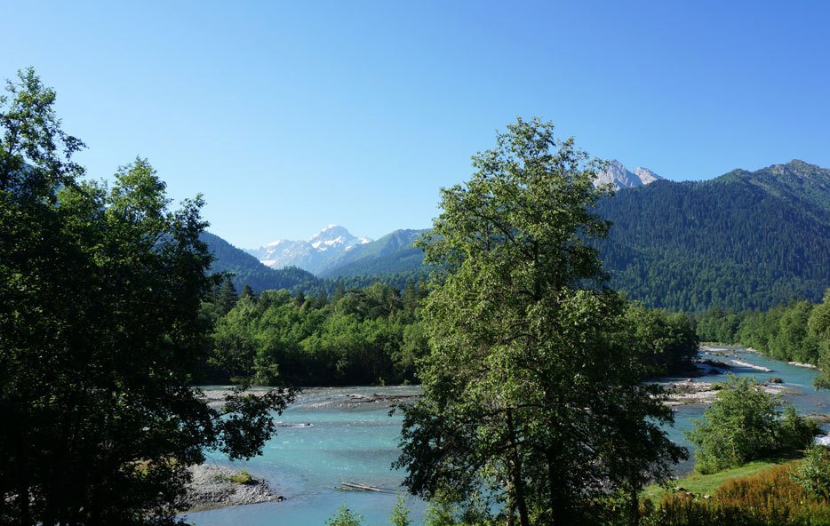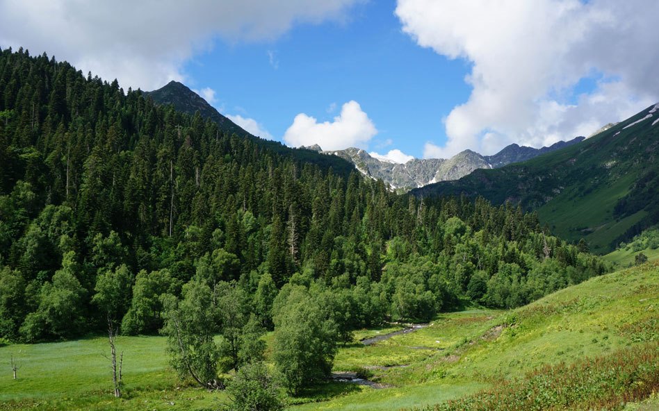 Отличная, ровная дорога ведет за собой из лагеря в живописную долину реки Псыш. С двух сторон от нас возвышаются величественные горные хребты: слева Софийский хребет, справа - пихтовый хребет Габулу. А вдалеке красуется самая высокая гора этих мест – Пшиш (3790 м).