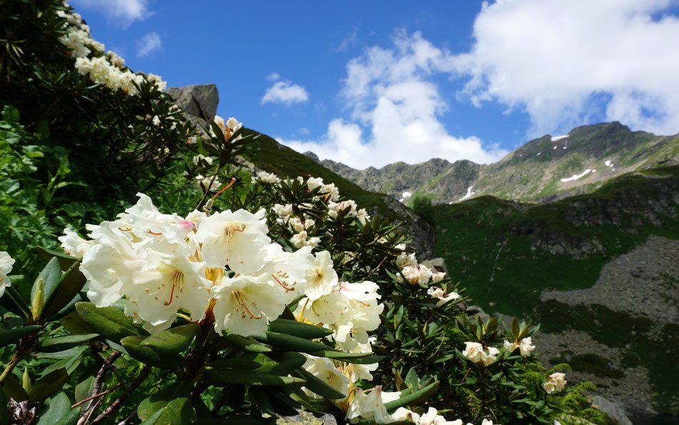 В июле здесь цветут рододендроны, розовые горцы, фиолетовые колокольчики, герань и нежно-голубые незабудки. В августе по маршруту появляются ягоды – спелая черника и брусника.