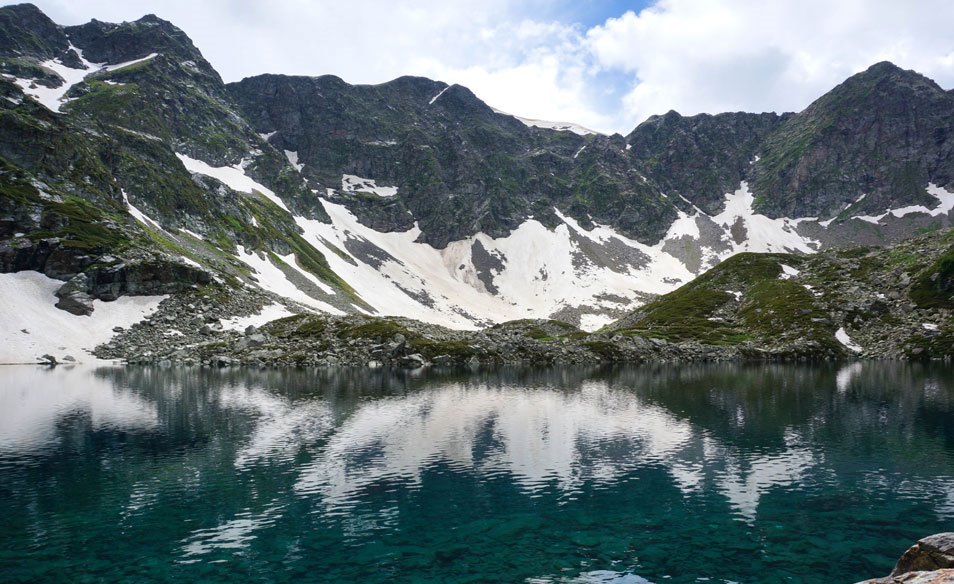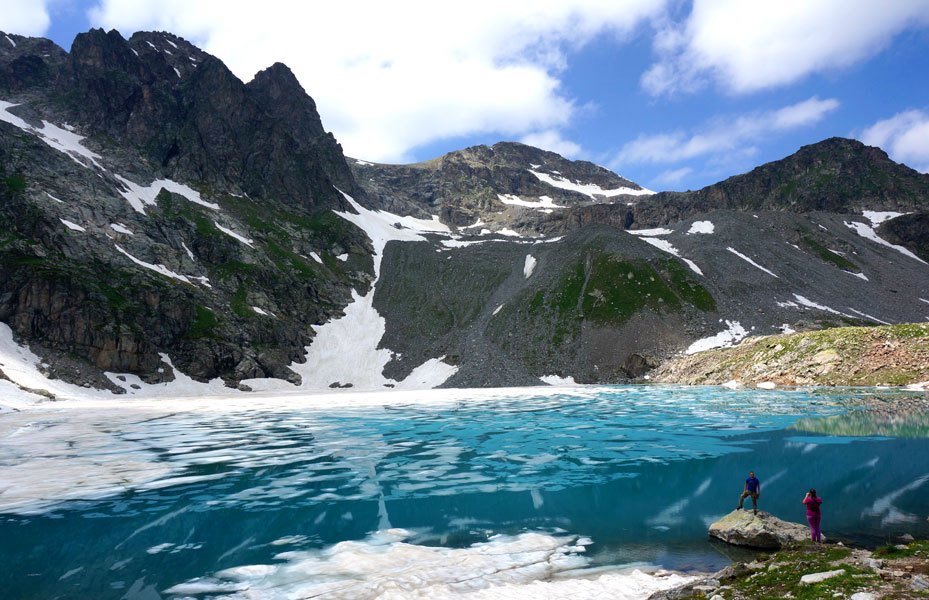 Поднявшись немного вверх по каменной морене, открывается еще один огромный скальный цирк с прекрасным, изумрудно-синим озером! Почти все лето на склонах цирка лежит снег, который искрится на солнышке и отражается белоснежными айсбергами в спокойной глади озера. На берегу выберем самое красивое место, сделаем привал и обед.