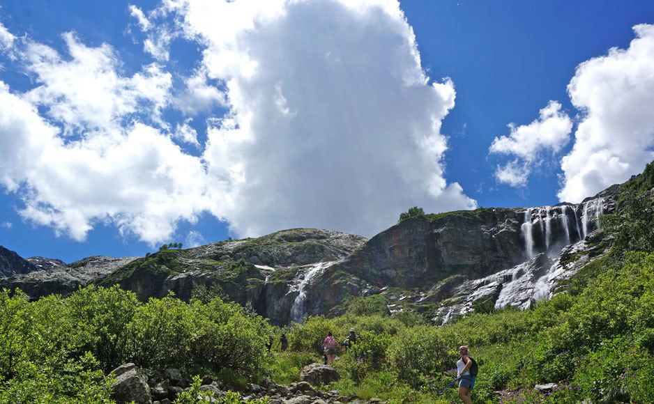 Чтобы добраться к водопадам, предстоит проехать по Софийской долине, вдоль реки София. Такое путешествие по горному Архызу совершим на внедорожнике – местном УАЗике. Горная дорога приведет на Ледниковую ферму - это большая туристическая поляна, где всегда стоят лагеря туристов.
