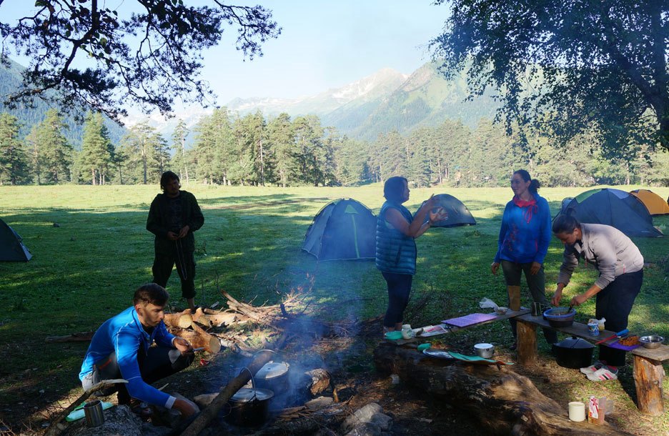 Программа тура предполагает проживание в палаточном лагере, который постоянно стоит на одном месте. Весь треккинг по ущельям совершаем налегке, без рюкзаков, поэтому в лагерь на Кавказе могут поехать родители с детьми и новички.