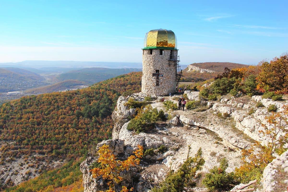 Дальше нас ждет прогулка по извилистой тропе, вдоль скальных обрывов. Вскоре мы увидим золоченый купол часовни. Возле нее расположен еще один пещерный монастырь – Шулдан (что в переводе означает «Неприступное место» или «Отдающий эхо»). Возле монастыря можно набрать воды и осмотреть храм. Кроме того, во время прогулки вы сможете побывать в нескольких естественных гротах, которые расположены в отвесных скалах. Безопасный путь к ним знают наши инструкторы-проводники.