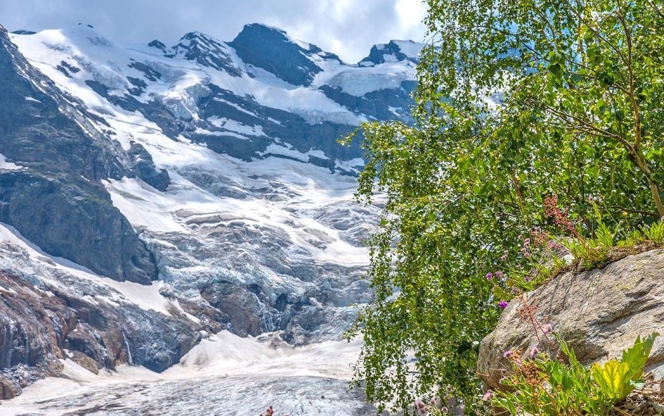 Транспорт привезет нас к альплагерю «Алибек» - это горный лагерь в Домбае для альпинистов. Возле него полюбуемся оленями в вольере и далее пойдем на огромную, цветочную поляну. В июле на здешних альпийских лугах настоящее буйство красок: синие, фиолетовые, ярко-розовые и желтые цветы покорят вас с первого взгляда. А теперь добавьте к этой картинке белоснежный ледник Алибек, который красуется на заднем фоне. Сразу становится понятно, почему это ущелье так любимо туристами!