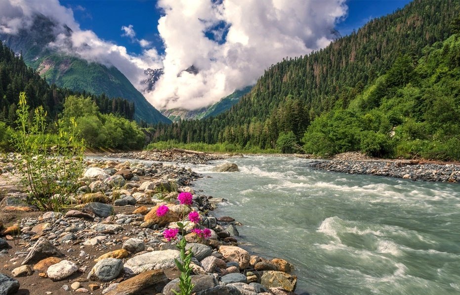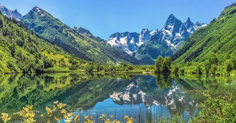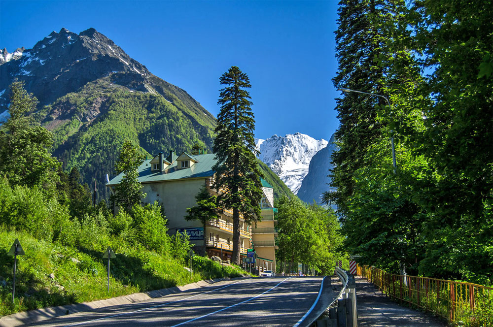 Этот туристический центр расположен у подножия Главного Кавказского хребта, вокруг возвышаются горы высотой 2500-4000 м. Домбай по праву считается одним из самых ярких уголков Западного Кавказа! Он славится своими масштабными и панорамными видами. В этих местах очень легко увидеть снег и яркие цветы в одном кадре.