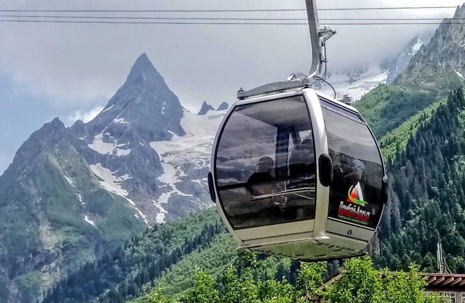 Канатные дороги очень быстро поднимают туристов на самый верх, на высоту 3200 м. Отсюда прекрасно видны горы Кавказа, панорама Главного Кавказского хребта, белоснежный Эльбрус и символ Домбая - гора Белалакая.