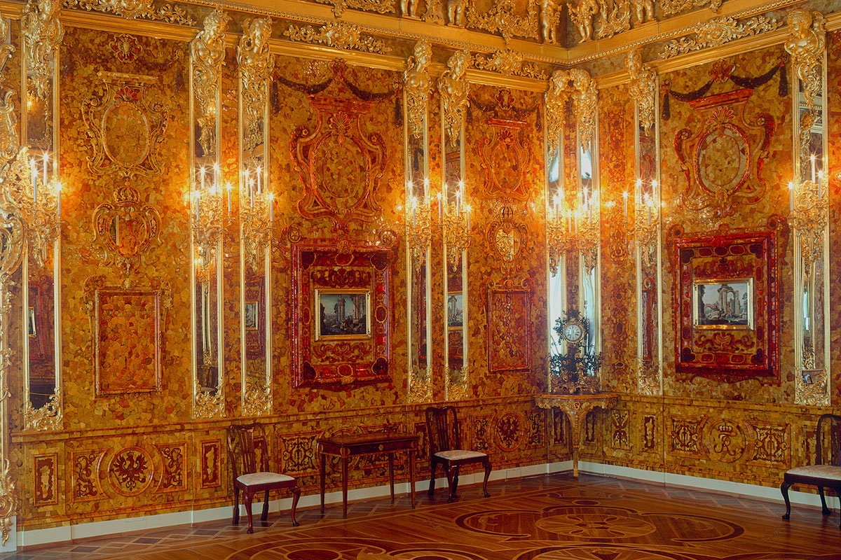 Гостей Царского Села потрясает фантастическая роскошь убранства Екатерининского дворца. Одним из залов Золотой анфилады Растрелли является знаменитая Янтарная комната, похищенная оккупантами во время Великой Отечественной войны и воссозданная петербургскими реставраторами, работу которых Вы сможете оценить во время экскурсии по Екатерининскому дворцу.