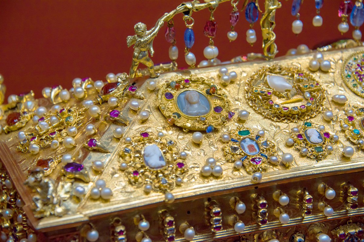 В Золотой кладовой представлено уникальное собрание золота скифских царей, изумительные по красоте и технике исполнения изделия мастеров Древней Греции, Сибирская коллекция Петра Великого. Здесь вы сможете полюбоваться драгоценностями стран Востока. Среди них, богато украшенные самоцветами сокровища Великих Моголов – дары правителя Ирана Надир-Шаха русскому Двору, филигранные китайские украшения, великолепные образцы парадного оружия.