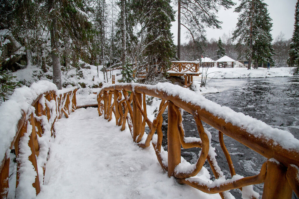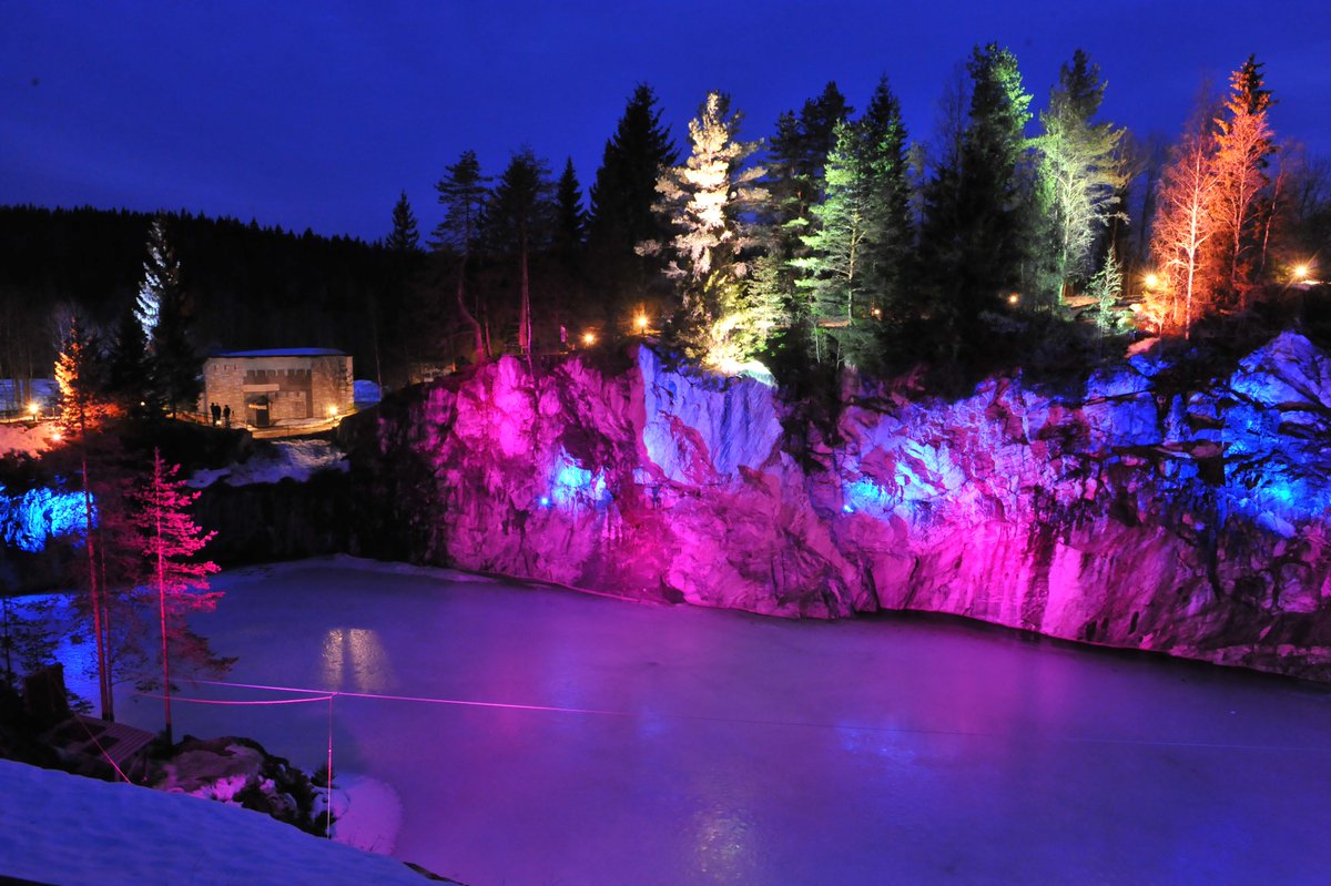 Горный парк «Рускеала» – главная круглогодичная достопримечательность Карелии. Территория горного парка огромна. Центром интереса является Мраморный каньон – большое, вытянутое с юга на север озеро с кристально чистой водой и отвесными берегами, состоящими из настоящего мрамора. Именно здесь когда-то добывали этот декоративный камень для отделки архитектурных шедевров Санкт-Петербурга. А благодаря темнеющим хвойным деревьям, снежному убранству и цветной подсветке на скалах пейзаж получается действительно сказочным!