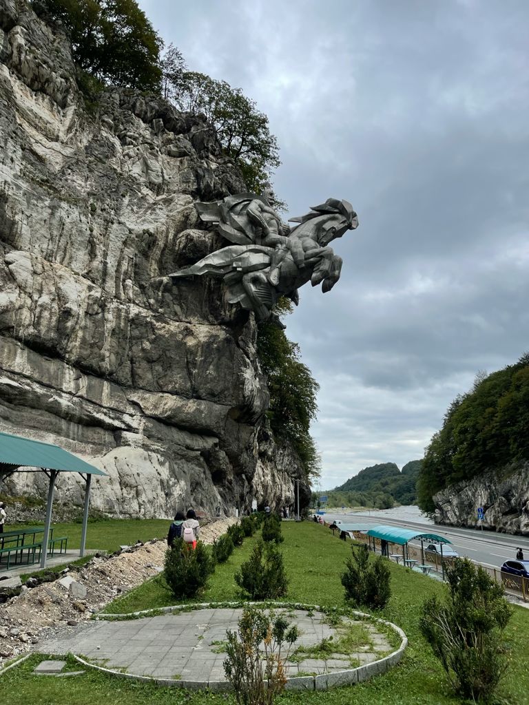 Двигаясь по Военно-Осетинской дороге в Алагирском ущелье, справа по ходу движения, наше внимание привлечёт необычайная скульптурная композиция. Это Ныхас Уастырджи, как называют его в Осетии. Это место является дзуаром - святым местом. Скульптура крепится к скале и весит 28 тонн! В осетинской традиции Георгий Победоносец носит имя Уастырджи, который также является одним из главных героев Нартского эпоса. Уастырджи - покровитель мужчин, путников и воинов.