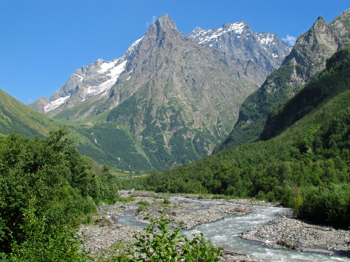 Домбай – это долина, по кругу ограниченная горами – типичный горный цирк. Среди них и высочайшая точка Западного Кавказа – гора Домбай-Ульген («убитый зубр»), высота 4047 м над уровнем моря. Подъем на канатных дорогах на высоту 3000 м (за доп. плату).