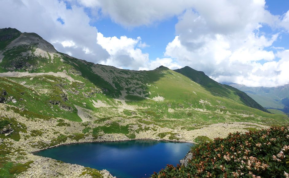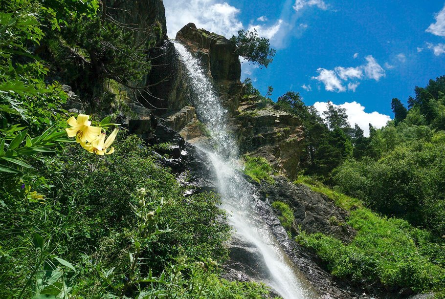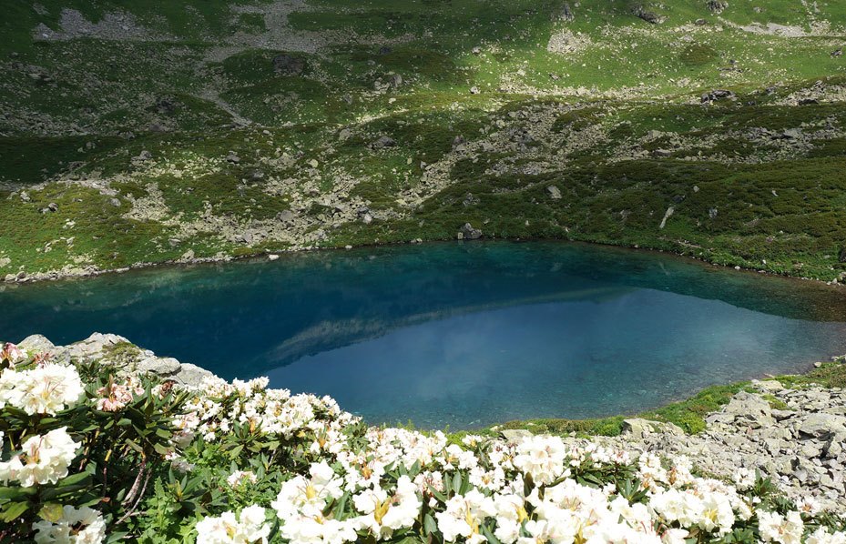 Малая Дукка, будто тяготится каменными тисками и шумно бурлит в отвоеванной у природы теснине. Треккинг пролегает по альпийским лугам, летом расцветающим наивно-голубыми незабудками, нарядно-розовыми горцами, серебристо-лавандовыми колокольчиками и мохнатыми рододендронами. Минуя эту горную клумбу, мы приблизимся к первому озеру, прозрачная вода которого отливает насыщенным малахитом.