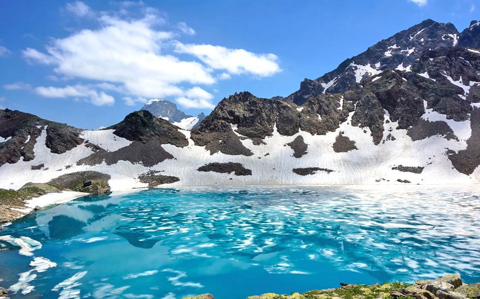 Еще чуть выше – и перед восхищенными взорами предстает второй водоем. Озеро находится в скальной чаше, на стенах которой никогда не тает снег, и отличается сапфирово-бирюзовым оттенком. Кажется, волшебник-великан, когда-то пролетая над этими горами, случайно уронил огромный, драгоценный камень.