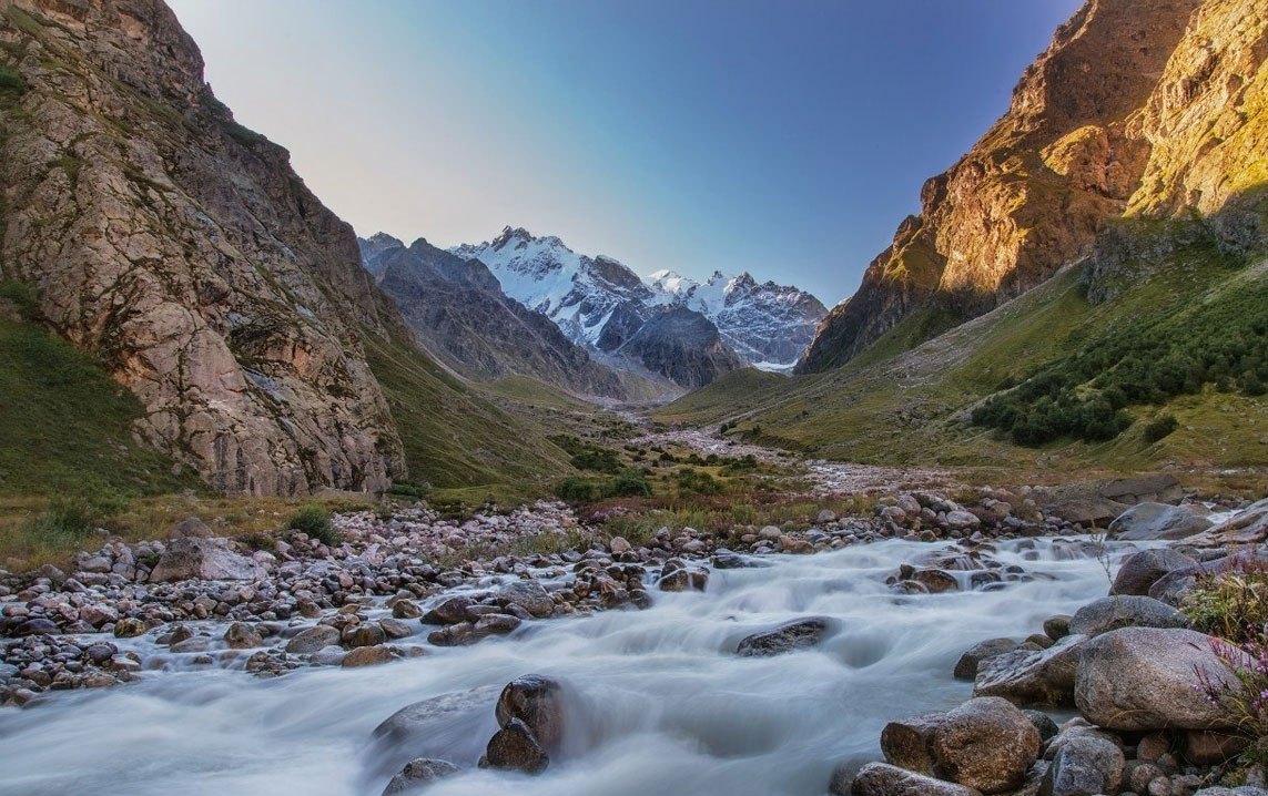 Главный Кавказский хребет здесь не просто близко, к нему можно дотронуться рукой. Приехав сюда, сразу же привлекает внимание огромная, белоснежная Безенгийская стена – это 12-километровый горный массив, самый высокий участок Главного Кавказского хребта. Из восьми «пятитысячников» Кавказа, шесть расположены в районе Безенгийского ущелья.