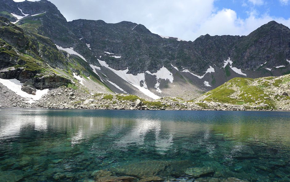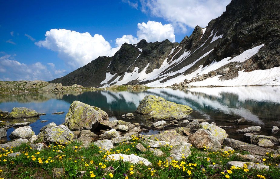 Поднявшись немного вверх по каменной морене, открывается еще один огромный скальный цирк с прекрасным, изумрудно-синим озером! Почти все лето на склонах цирка лежит снег, который искрится на солнышке и отражается белоснежными айсбергами в спокойной глади озера. На берегу выберем самое красивое место, сделаем привал и обед.