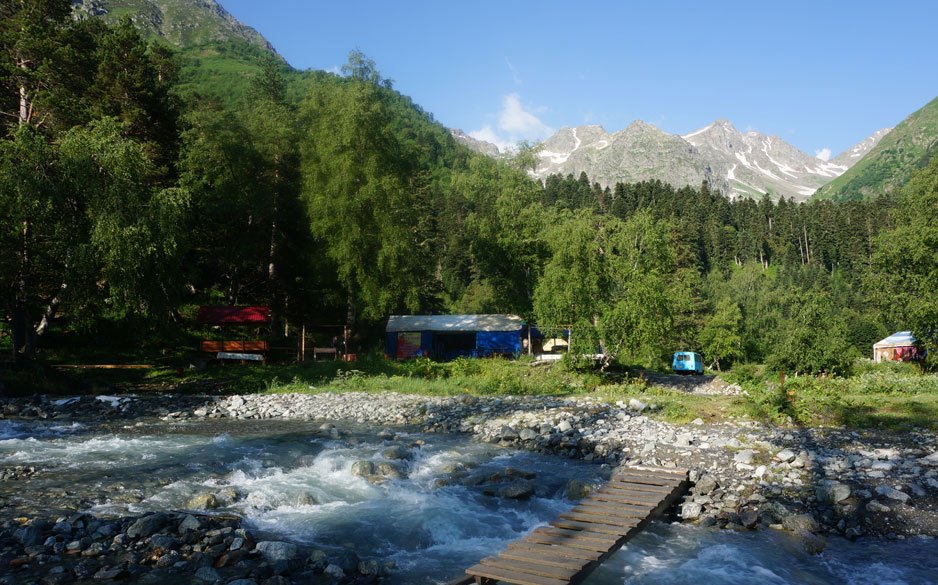 Программа тура предполагает проживание в палаточном лагере, который постоянно стоит на одном месте. Весь треккинг по ущельям совершаем налегке, без рюкзаков, поэтому в лагерь на Кавказе могут поехать родители с детьми и новички.