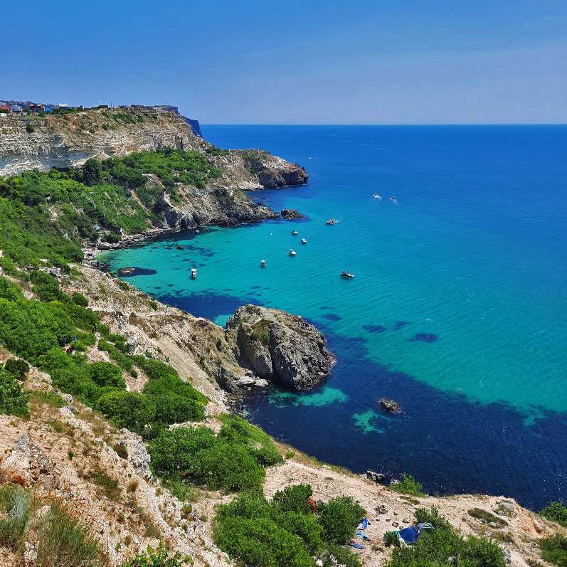 Фиолент переводится как «Тигровый мыс». Это место с бирюзовой водой, уютными бухтами, родниками и палаточными городками. Поверьте нам, уникальный цвет этих бухт вы запомните надолго! Вода здесь лазурная и невероятно прозрачная. В местные бухты очень любят приплывать белоснежные яхты с туристами. Яхты останавливаются в море и, кажется, они словно парят в воздухе.