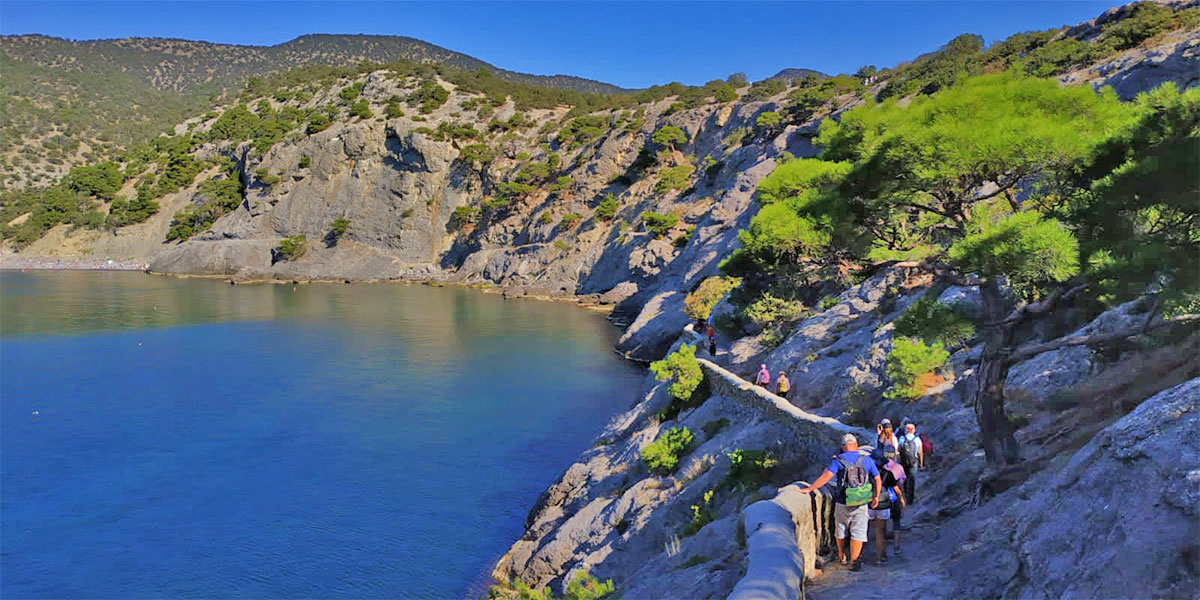 Погода в Новом Свете в сентябре и октябре – великолепная, ходить уже не очень жарко, поэтому треккинг продолжается на Голицынской тропе – знаменитой дороге, по приказу князя-винодела Голицына вырубленной в скале, ведущей мимо Синей бухты и грота Шаляпина.