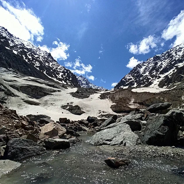 Пройдя большую часть пути, выйдем к беседке. Здесь лес расступается – и прямо перед нами открываются высокие горы, а вдалеке блестит ледник Цей. Идем поближе к леднику! Вблизи он смотрит живым, огромным. Ледник словно дышит, постоянно шумит и живет своей жизнью. Из-под ледника вытекает очень бурный поток воды.