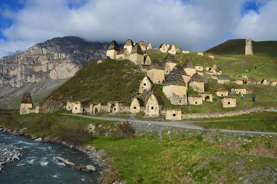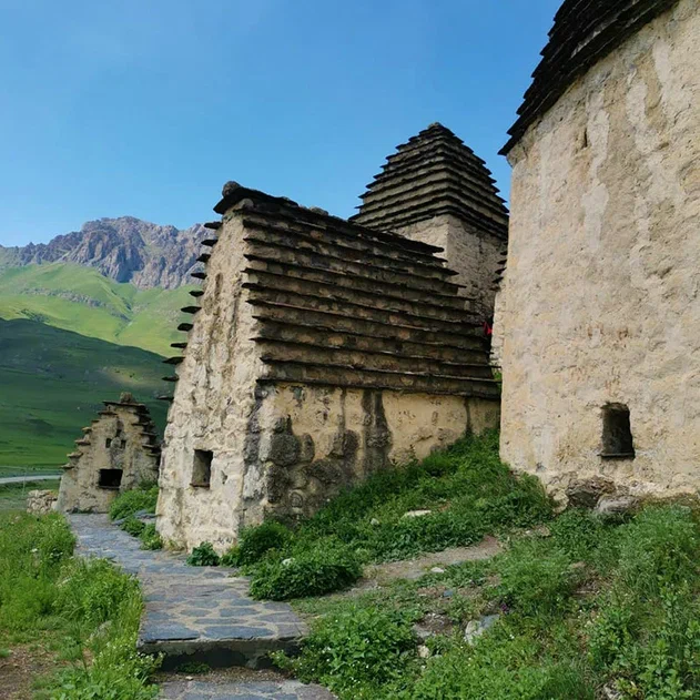 Безусловно, одна из изюминок сегодняшней экскурсии – это Даргавс! Те самые необычные, белые домики с коричневыми крышами, которые так привлекают ваше внимание на фотографиях. Даргавс – визитная карточка Осетии. Это некрополь, который насчитывает около 90 склепов построенных в виде пирамид.
