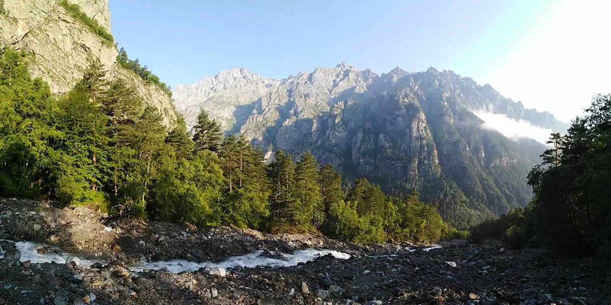Путь к Цейскому леднику идет по хвойному лесу, вдоль высоких, утонченных гор. По всему пути нас сопровождает река Цейдон. В реке часто можно увидеть поваленные деревья, которые здесь очень гармонично смотрятся и придают особую красоту этому каньону.