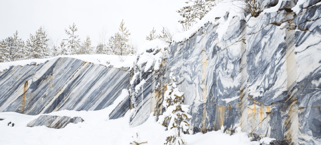 Горный парк «Рускеала» – главная круглогодичная достопримечательность Карелии. Территория горного парка огромна. Центром интереса является Мраморный каньон – большое, вытянутое с юга на север озеро с кристально чистой водой и отвесными берегами из настоящего мрамора. Именно здесь когда-то добывали этот декоративный камень для отделки архитектурных шедевров Санкт-Петербурга. А благодаря темнеющим хвойным деревьям, снежному убранству и цветной подсветке на скалах пейзаж получается действительно сказочным!