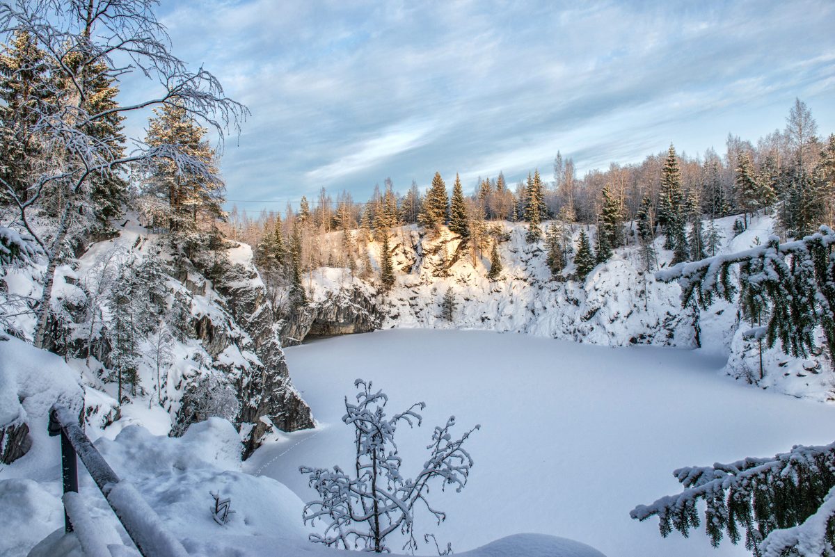 - Прогуляться по дорожкам вокруг Мраморного каньона. Их здесь километры. В холодное время года каждый уголок природы наполнен зимним таинством. Если отойти от экскурсионного маршрута, можно наткнуться на атмосферные и красивые места: Монферраново озеро, Итальянский карьер и сад камней, Светлое озеро с дикими тропинками, заброшенный мраморный завод, мраморные утесы, обзорные площадки, гроты и штольни.