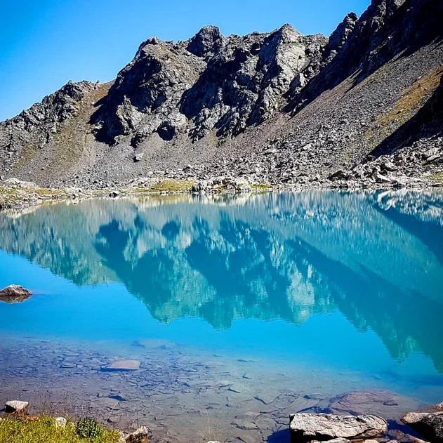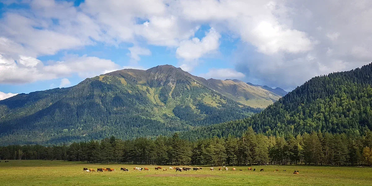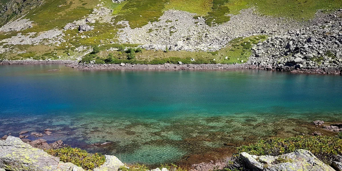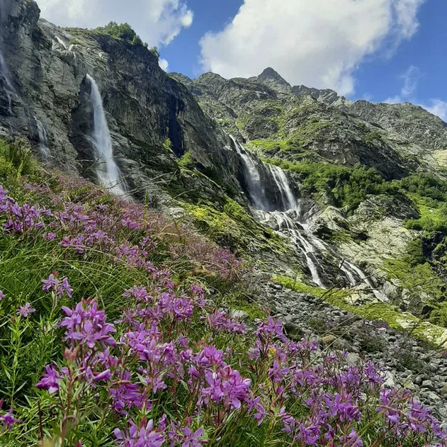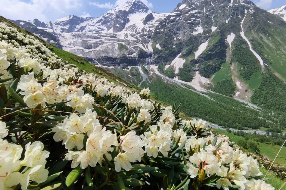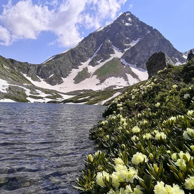 Малая Дукка, будто тяготится каменными тисками и шумно бурлит в отвоеванной у природы теснине. Треккинг пролегает по альпийским лугам, летом расцветающим наивно-голубыми незабудками, нарядно-розовыми горцами, серебристо-лавандовыми колокольчиками и мохнатыми рододендронами. Минуя эту горную клумбу, мы приблизимся к первому озеру, прозрачная вода которого отливает насыщенным малахитом.