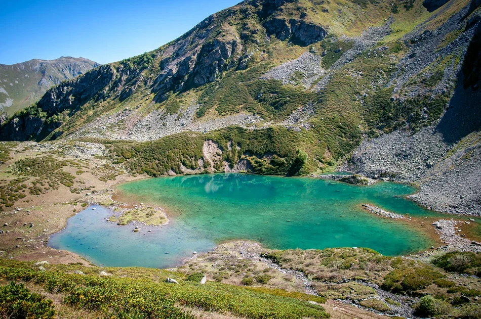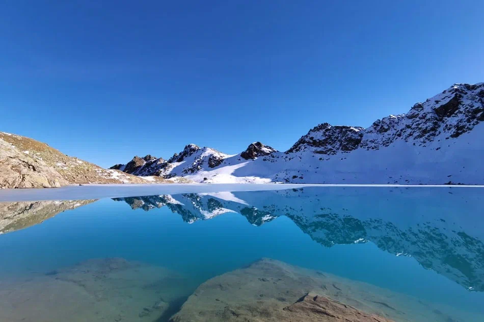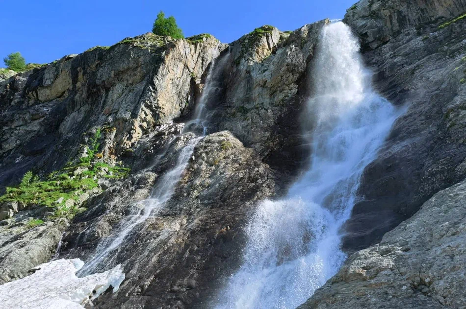 Еще чуть выше – и перед восхищенными взорами предстает второй водоем. Озеро находится в скальной чаше, на стенах которой никогда не тает снег, и отличается сапфирово-бирюзовым оттенком. Кажется, волшебник-великан, когда-то пролетая над этими горами, случайно уронил огромный, драгоценный камень.