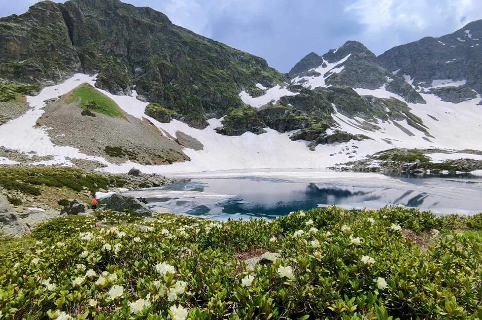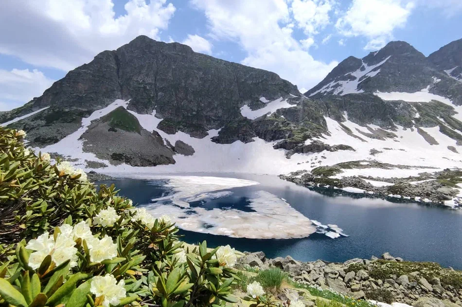 После умопомрачительной троицы Софийских водоемов, пятый день тура подготовил еще один сюрприз – поход к прекрасному Айматлы-Джагалыкёль. Это озеро с изрезанной береговой линией и никогда не тающей снежной коркой на склонах чаши. Ниже водоема летом зацветают альпийские луга, пестреющие курчавыми рододендронами, трогательными горцами, лимонными девясилами и сапфировыми незабудками.