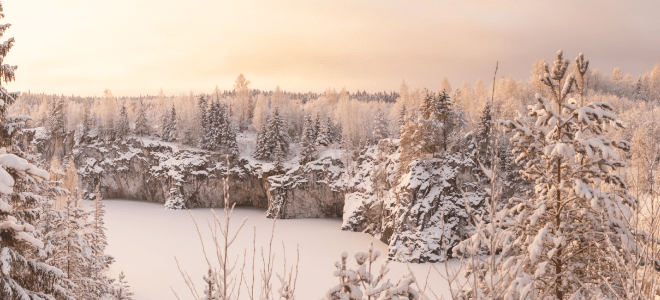 Горный парк «Рускеала» – главная круглогодичная достопримечательность Карелии. Территория горного парка огромна. Центром интереса является Мраморный каньон – большое, вытянутое с юга на север озеро с кристально чистой водой и отвесными берегами, состоящими из настоящего мрамора. Именно здесь когда-то добывали этот декоративный камень для отделки архитектурных шедевров Санкт-Петербурга. А благодаря темнеющим хвойным деревьям, снежному убранству и цветной подсветке на скалах пейзаж получается действительно сказочным!