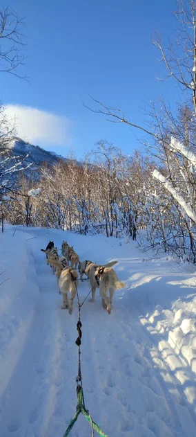 Мы отправимся на перевал, между двумя вулканами Корякским и Авачинским. Дорога сюда займёт около двух часов, по живописной зимней дороге среди заснеженных склонов вулканов, по руслу реки. Все время в пути вы будете сидеть на пассажирской нарте, которую везет за собой снегоход.
