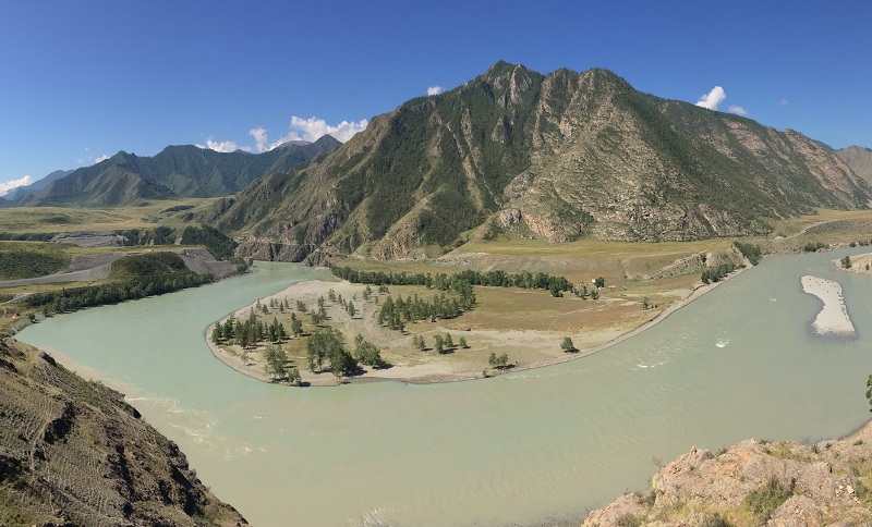 Фотостоп в месте слияния Чуи и Катуни – Чуй-Оозы: кремовые воды Чуи и бирюзовые Катуни прежде чем смешаться «идут» рука об руку вместе. В очертаньях горы, высящейся над слиянием рек, можно увидеть голову богатыря и его лошади.