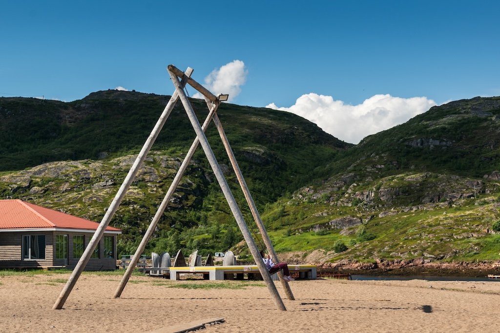 Песчаный пляж с гигантскими качелями в Териберке