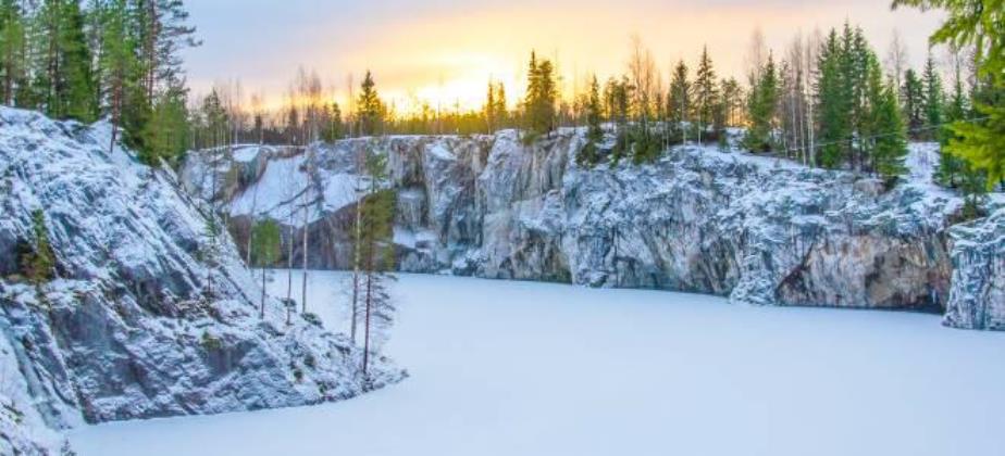 Горный парк «Рускеала» – главная круглогодичная достопримечательность Карелии. Территория горного парка огромна. Центром интереса является Мраморный каньон – большое, вытянутое с юга на север озеро с кристально чистой водой и отвесными берегами, состоящими из настоящего мрамора. Именно здесь когда-то добывали этот декоративный камень для отделки архитектурных шедевров Санкт-Петербурга. А благодаря темнеющим хвойным деревьям, снежному убранству и цветной подсветке на скалах пейзаж получается действительно сказочным!