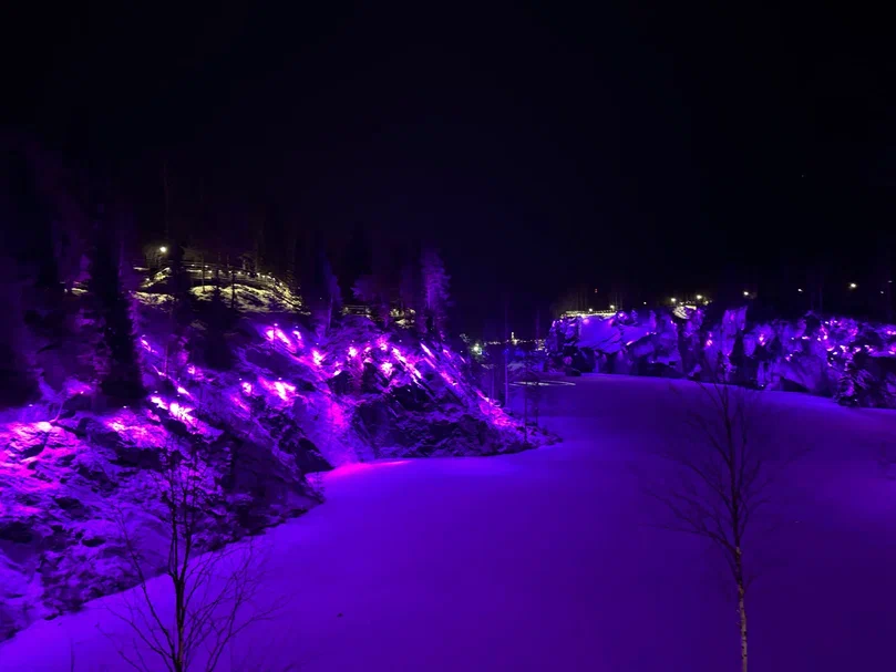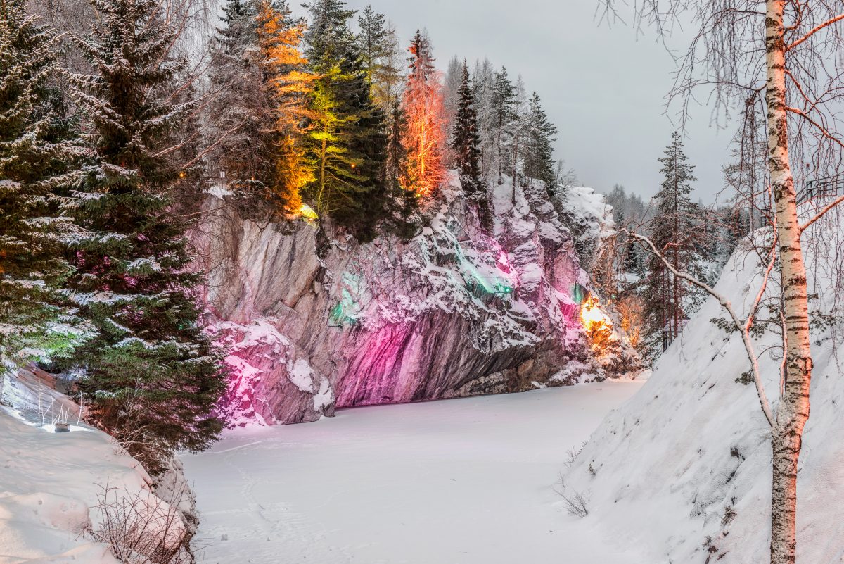 Горный парк «Рускеала» – главная круглогодичная достопримечательность Карелии. Территория горного парка огромна. Центром интереса является Мраморный каньон – большое, вытянутое с юга на север озеро с кристально чистой водой и отвесными берегами из настоящего мрамора. Именно здесь когда-то добывали этот декоративный камень для отделки архитектурных шедевров Санкт-Петербурга. А благодаря темнеющим хвойным деревьям, снежному убранству и цветной подсветке на скалах пейзаж получается действительно сказочным!