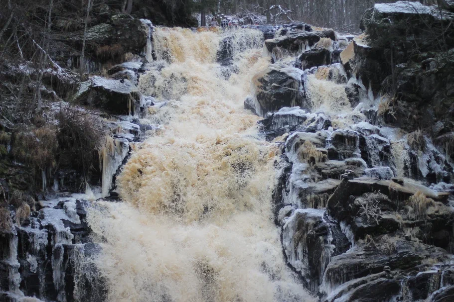 «Братья-падуны», как их называют местные жители, были бы единым целым, если бы не остров посреди реки, который делит течение надвое. В результате образовались два водопада – 18-метровый и 11-метровый. Они такие мощные, что даже суровой зимой не замерзают полностью, а дышат и сопротивляются морозу под ледяным панцирем, пробиваясь наружу.