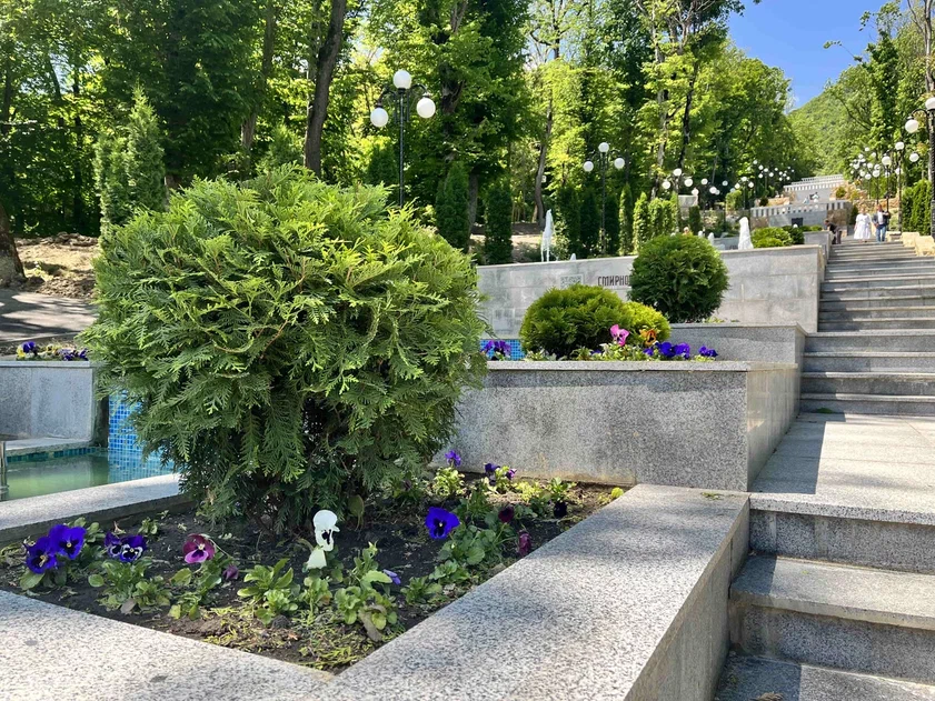 зодиакальных часов, чьи тени движутся в такт светилу. Воздух наполнен ароматом цветов, ведущих к ажурной Пушкинской галерее, где под сводами до сих пор слышен шёпот вальса. Бронзовый памятник А.С. Пушкину застыл в задумчивости на фоне гор. Дальше — встреча с живой водой: источники «Славяновский» и «Смирновский» дарят глоток здоровья, а Каскадная лестница, подобная гигантскому цветущему растению, ведет к спокойной глади Курортного озера.