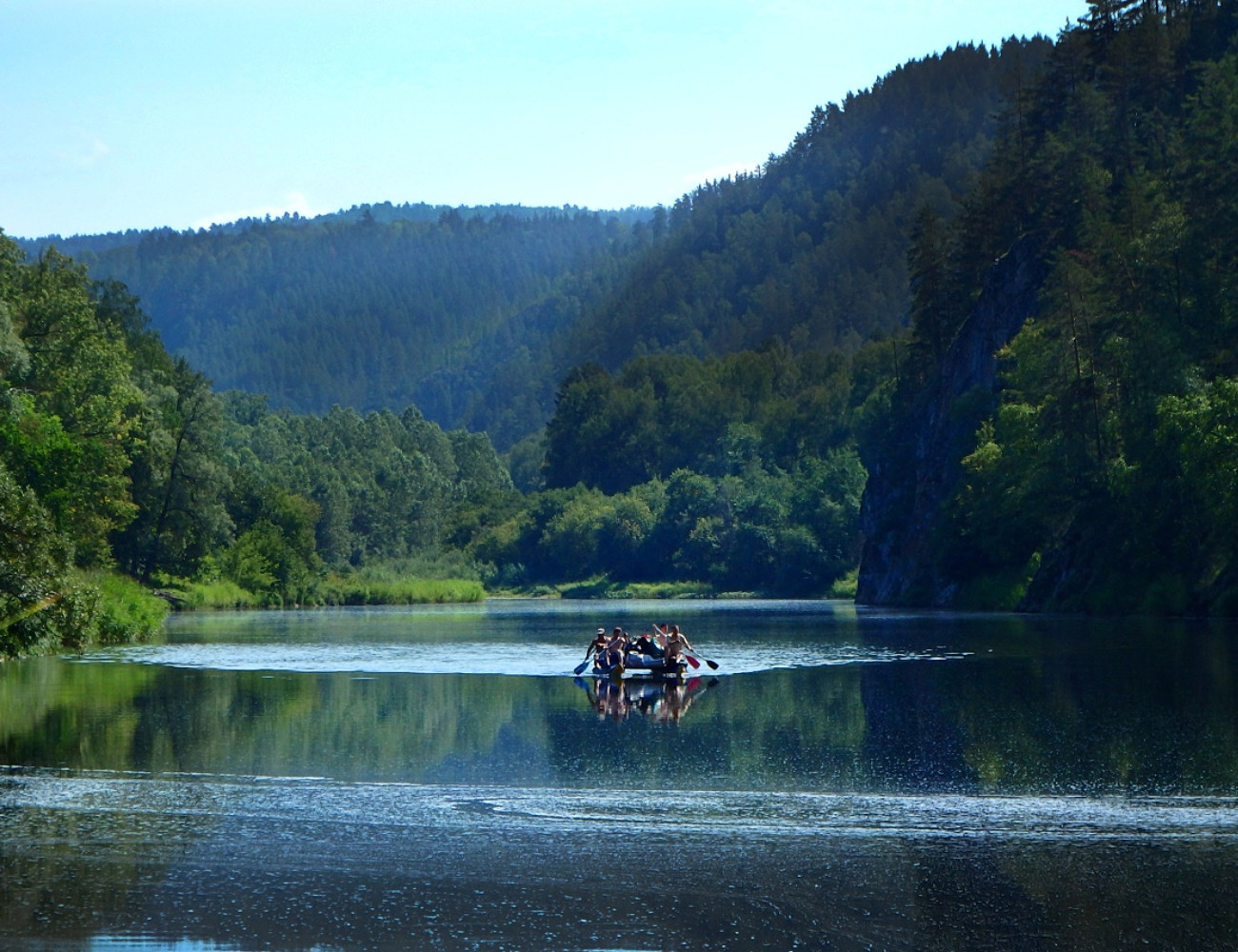 Спокойное течение реки, зеленые берега и живописные скалы. Во время сплава предполагается остановка для отдыха и обеда в полевых условиях и купания. Снятие с маршрута и трансфер до базы «Тенгри».