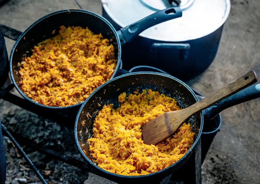 - Общий пикник у костра. В меню: карельская уха из форели, греча с тушенкой, салат из свежих овощей, горячий чай с лимоном и печеньем. И, конечно же «победные» 150 г карельских алкогольных напитков для взрослых.